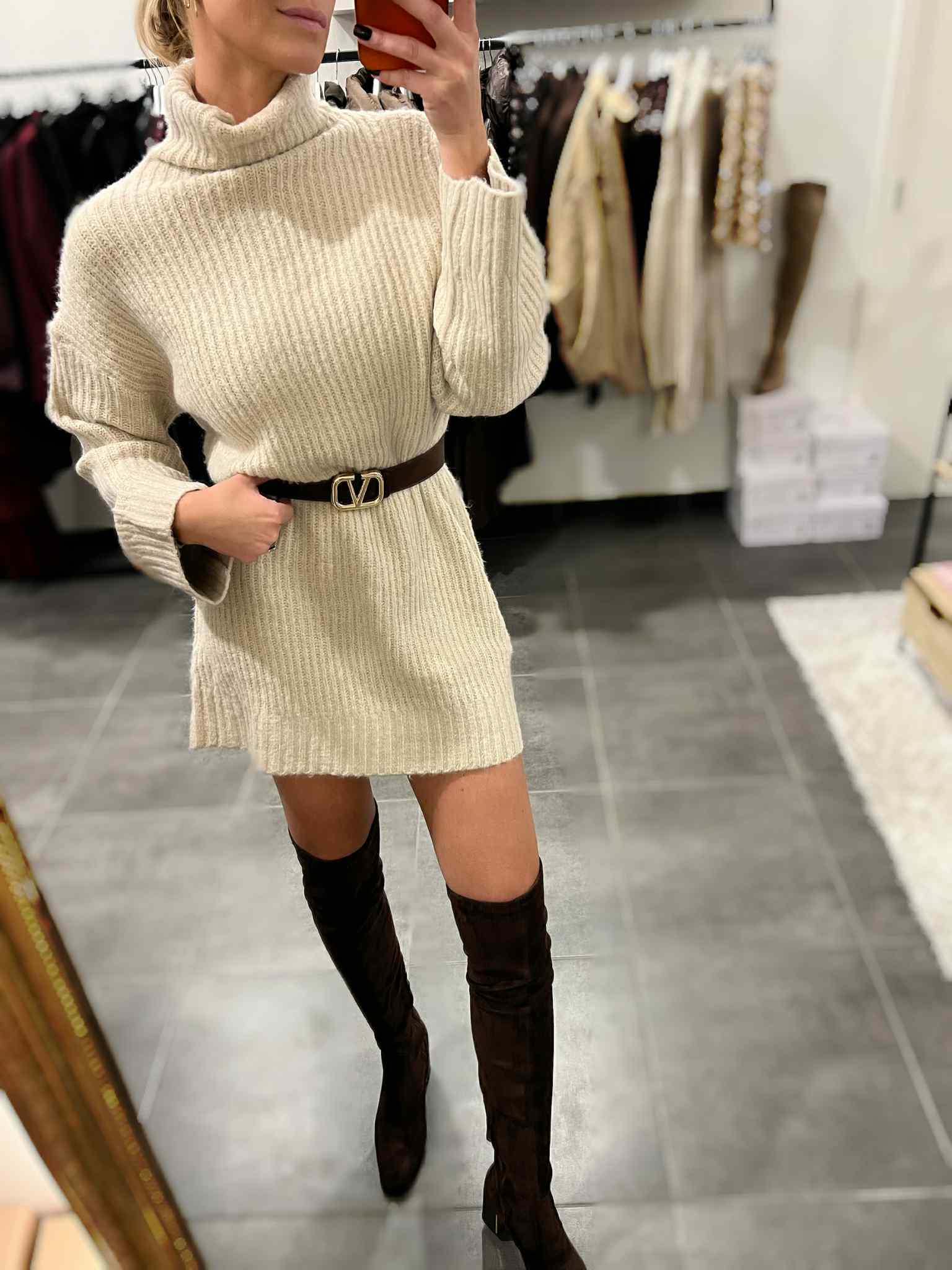 • Deze sweaterjurk heeft een opstaande col en zachte stof